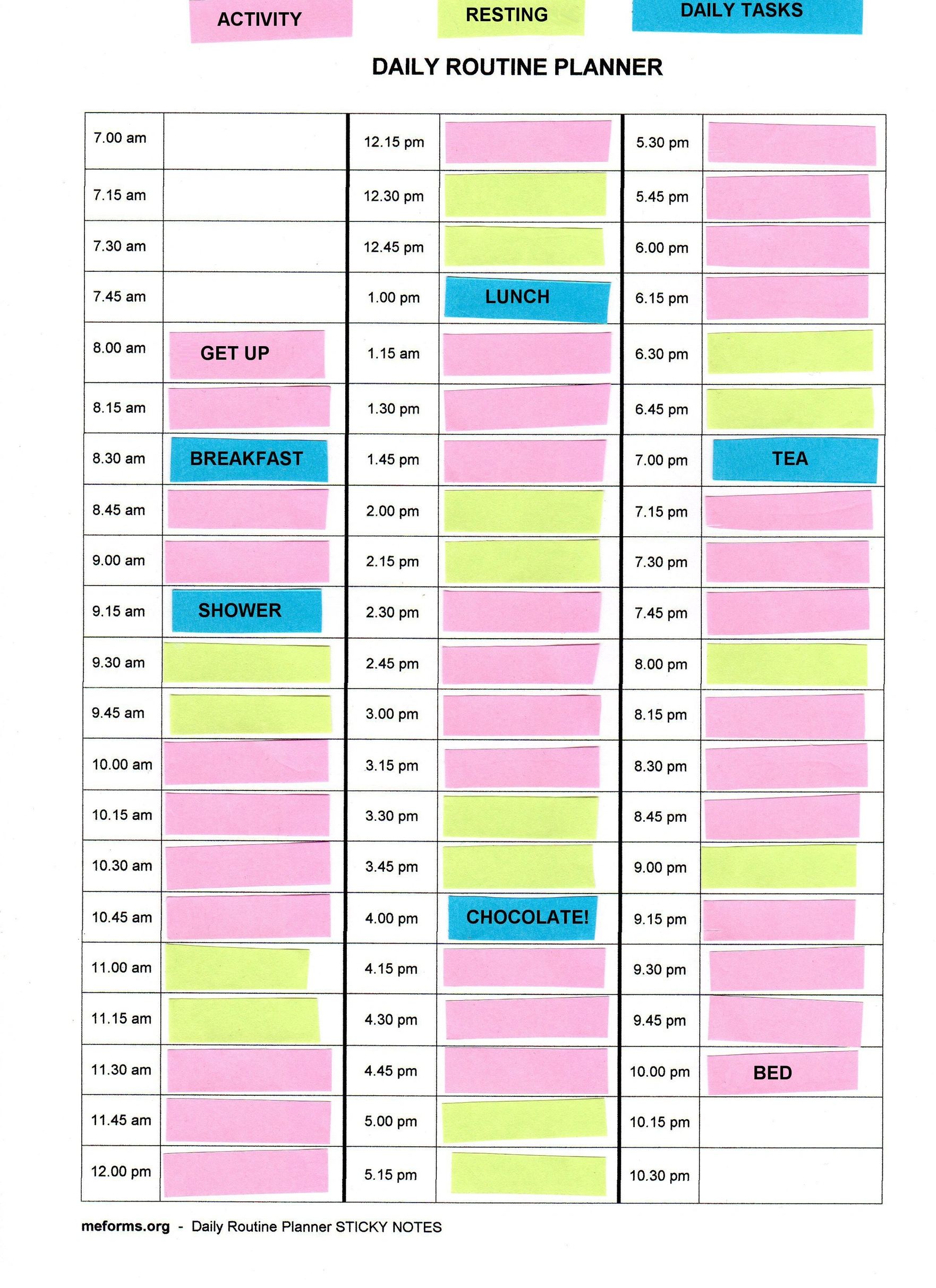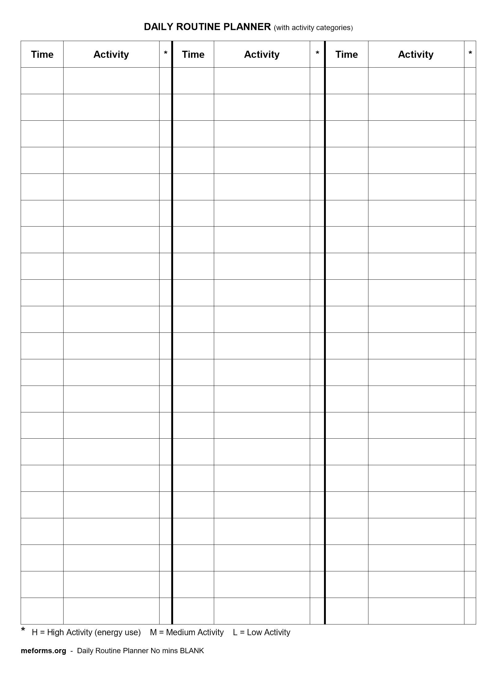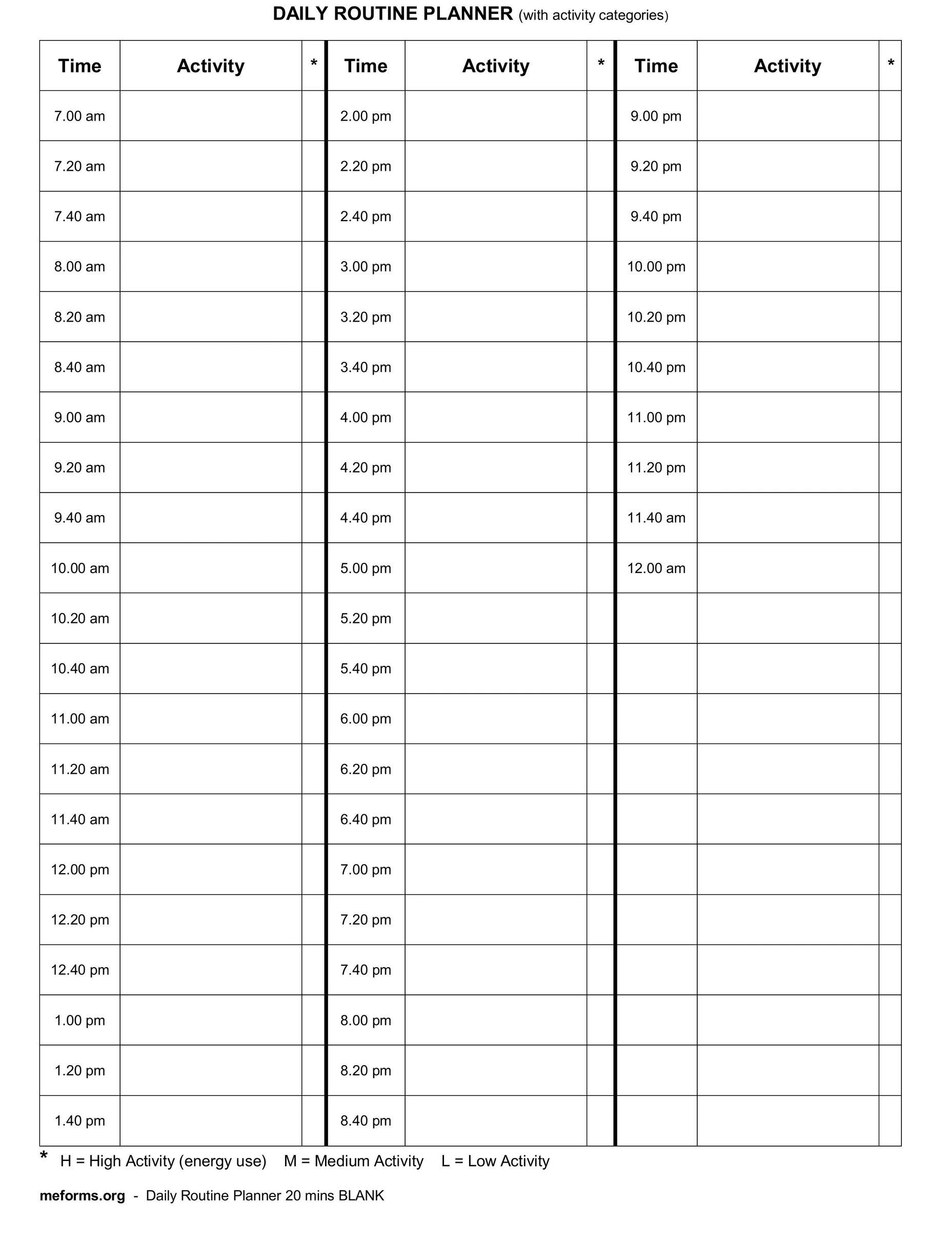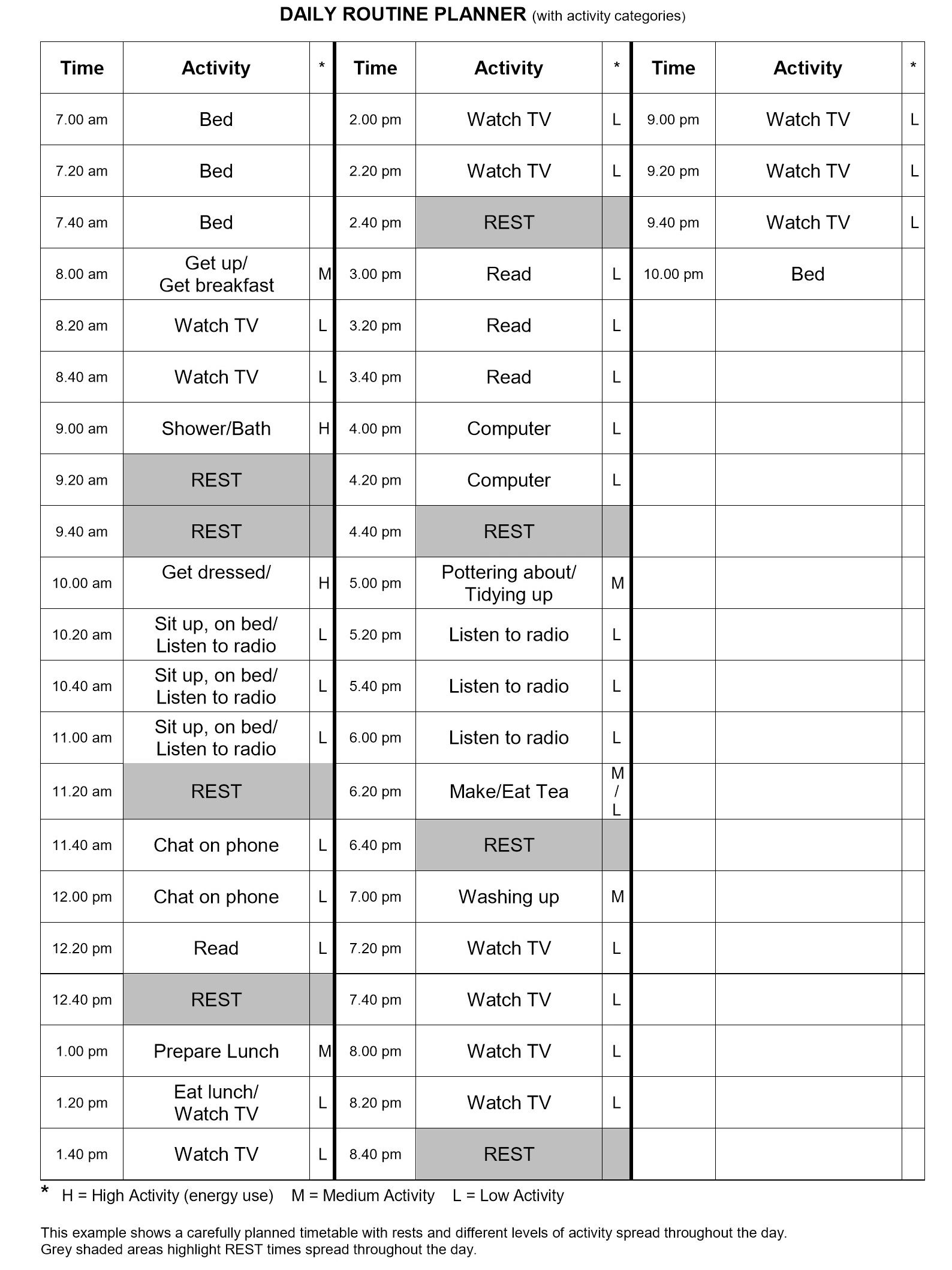This form helps you plan a balanced and sustainable daily routine. Use the information you have gathered on the Daily or Weekly Record of Activity and consider how to improve your current activity and rest regime - then record an improved schedule on the Daily Routine Planner. The Activity Categories form will also help when thinking how to spread High, Medium and Low activity throughout the day. (Your routine can be adjusted when you feel ready to increase activity - or decrease in the case of a relapse.)